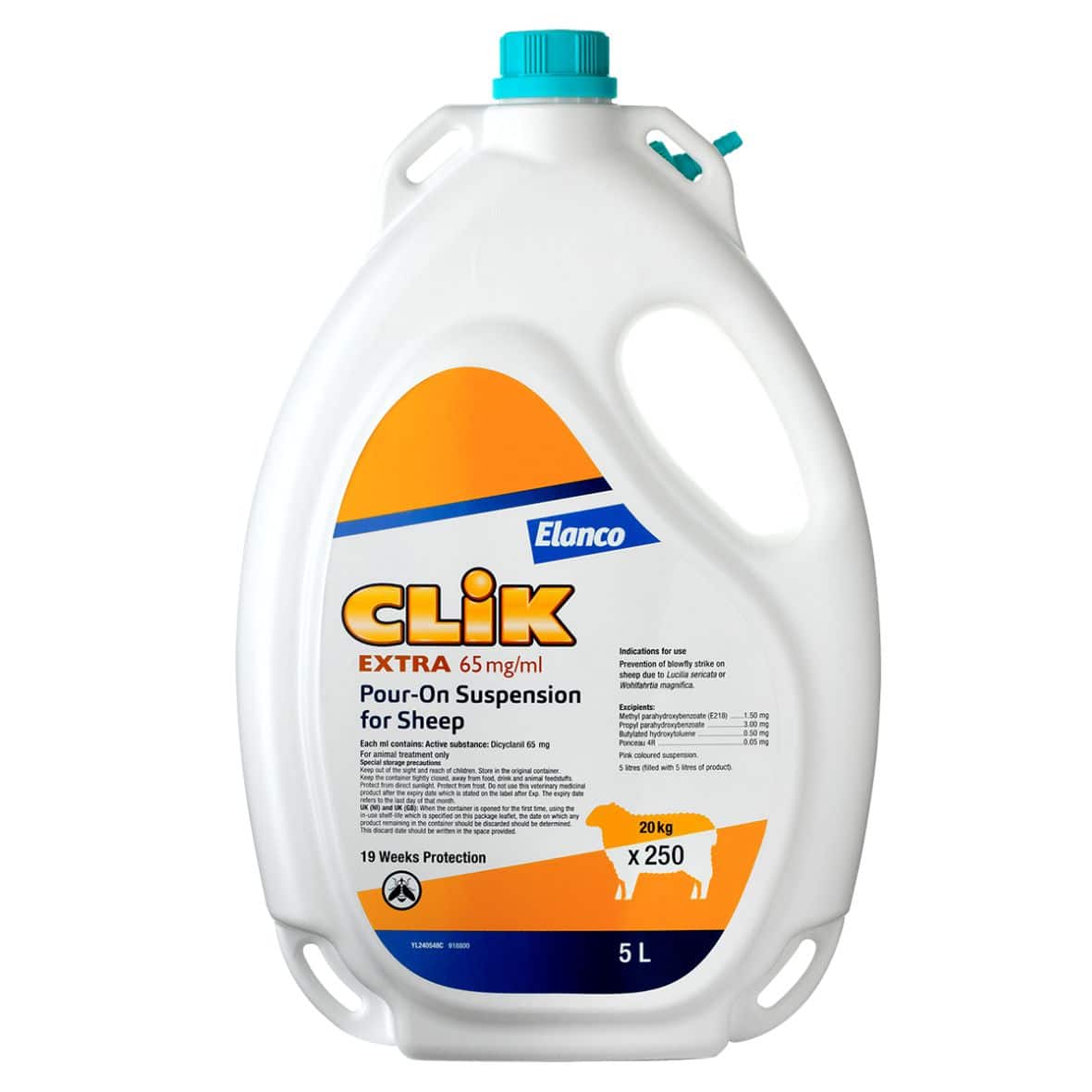 CLiK EXTRA Pour On is?a water-based, ready-to-use pour on suspension containing 65mg/ml dicyclanil, for the prevention of?blowfly strike?on sheep. This treatment for Blow fly lasts arounf 19 weeks.